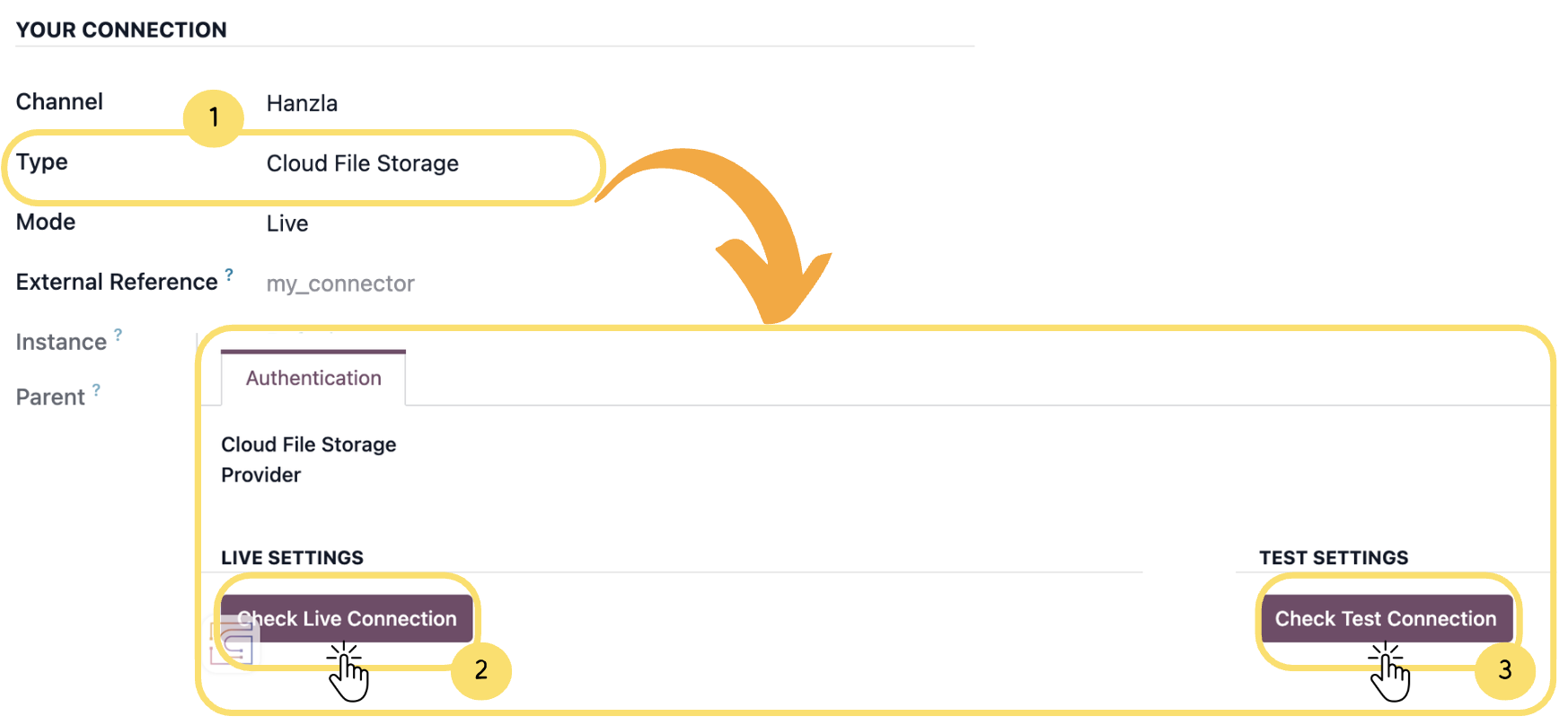 After selecting the appropriate type, complete the required settings and use the available connection checks to verify that the connector is working correctly in both Test and Live modes before proceeding.