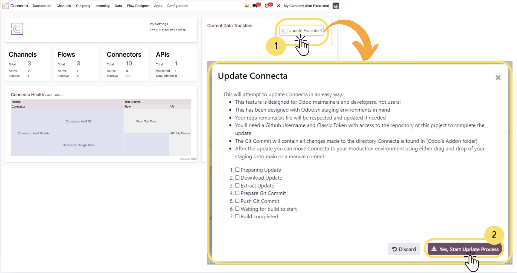 This guide explains how to update Connecta using the built-in update mechanism designed for Odoo.sh staging environments. This process is intended for maintainers and developers, not end users.